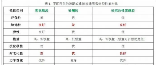 相比于現(xiàn)澆式建筑,裝配式建筑內(nèi)外墻存在更多拼接縫,這讓建筑防水密封面臨更多的重難點(diǎn),而密封膠的性能則會(huì)直接影響裝配式建筑的防水效果,因此密封膠的選用和施工就顯得至關(guān)重要。目前市面上常見(jiàn)的裝配式建筑接縫用密封膠主要有:聚氨酯類(lèi)、硅酮類(lèi)、硅烷改性聚醚類(lèi)等。不同的分子結(jié)構(gòu)決定了各類(lèi)密封膠的理化性能差異,這里匯總了這三類(lèi)密封膠的性能對(duì)比(表1):