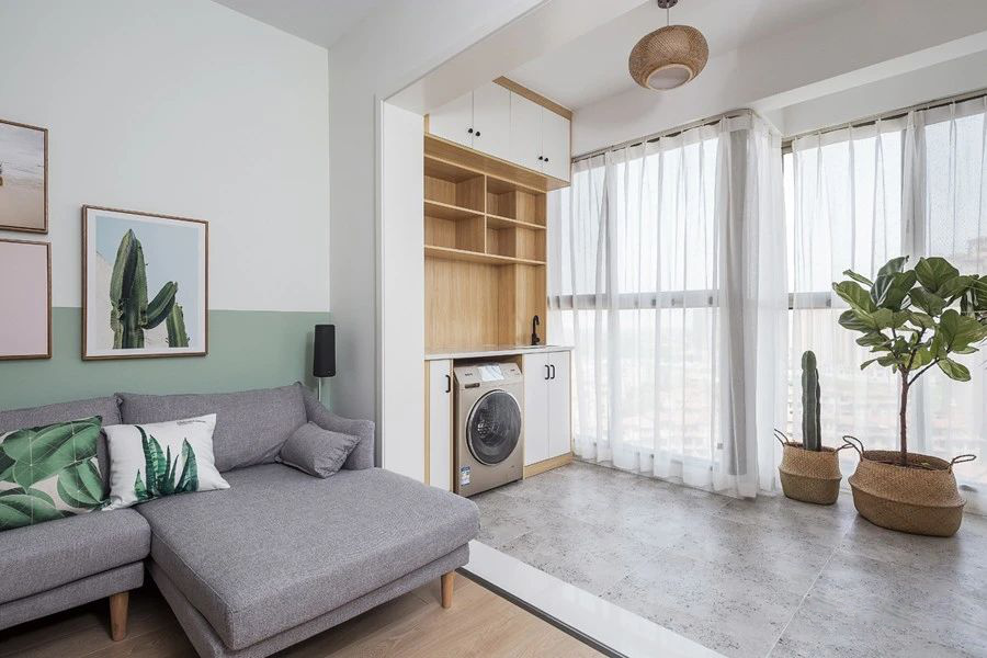 陽(yáng)臺(tái)本身是一個(gè)狹小的空間,承載著儲(chǔ)物、洗衣、晾衣、盥洗、休憩等重任,也是親子游戲、家人聊天的別致場(chǎng)地。因此,陽(yáng)臺(tái)作為室內(nèi)空間的延伸,需要巧妙提升儲(chǔ)物功能,也需要兼顧空間分割的美感。