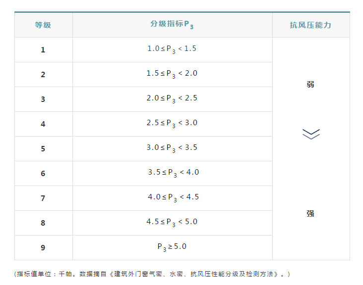 抗風(fēng)壓性能是指關(guān)閉著的外(門)窗在風(fēng)壓作用下,不發(fā)生損壞和功能障礙的能力。抗風(fēng)壓性能一共分為9個等級,等級越高代表其抗風(fēng)壓能力就越強(qiáng)。值得注意的是,抗風(fēng)壓性能等級并不等同于臺風(fēng)等級。抗風(fēng)壓性能9級表示窗戶可承受5000pa以上的風(fēng)壓,但不能簡單對應(yīng)同樣的臺風(fēng)等級。