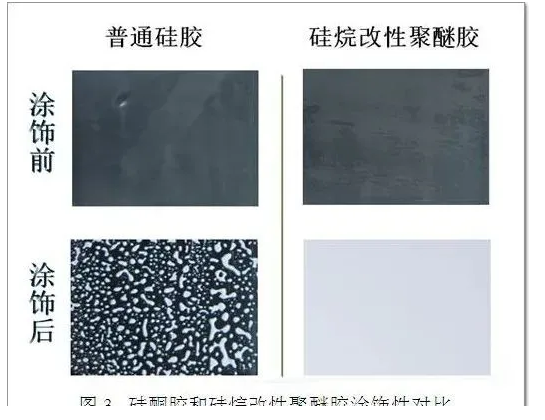 5. 可涂飾性 硅烷改性聚醚膠表面可涂飾面漆或涂料,而涂料在硅酮膠表面難以浸潤(rùn)和鋪展均勻(如圖3所示)。因此有涂飾需求的膠縫,需選用硅烷改性聚醚膠,不能選用硅酮密封膠;無(wú)涂飾需求的膠縫,可選用硅烷改性聚醚膠或者硅酮密封膠。
