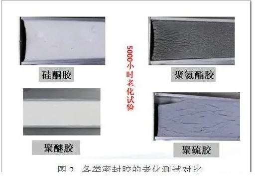 硅烷改性聚醚膠的良好耐候性來(lái)源于其分子結(jié)構(gòu)中的Si-O鍵,該化學(xué)鍵的鍵能高于紫外線的能量。優(yōu)異的耐候性充分保證了裝配式建筑膠縫的長(zhǎng)久密封與安全。下圖是各類(lèi)密封膠耐老化性測(cè)試的對(duì)比,白云牌SMP651裝配式專(zhuān)用硅烷改性聚醚膠產(chǎn)品,在經(jīng)歷5000h老化后,表面仍無(wú)開(kāi)裂現(xiàn)象(見(jiàn)圖2)。