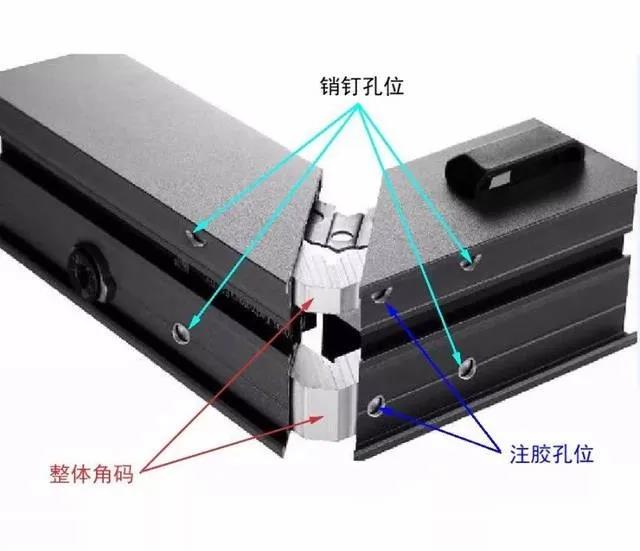 銷釘注膠工藝所用的角碼,是由甲柄材質(zhì)的角碼膠片與4.0-5.0mm厚度一體式的純鋁角碼結(jié)合的特制角碼,這種角碼擁有更強的韌性及穩(wěn)定性。組裝時灌入耐候性超強的優(yōu)質(zhì)進口組角膠進行密封,加強了整扇門窗的密封性能。