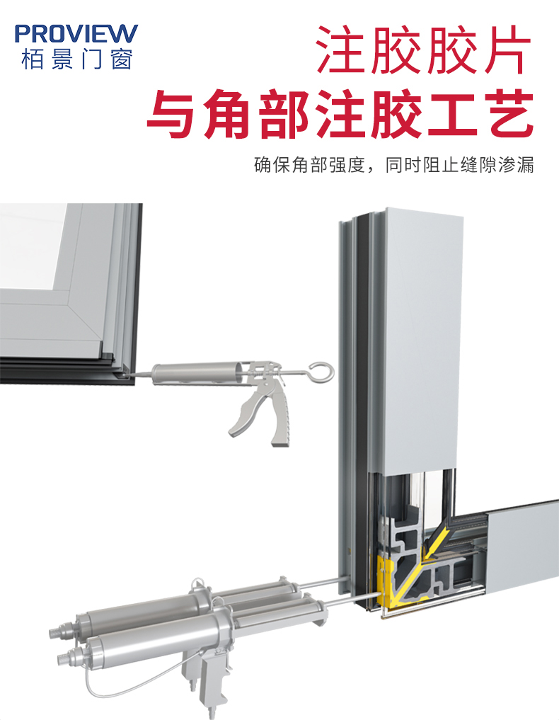 栢景系統(tǒng)門窗選用6063-T5航天級高精鈦美鋁合金材質(zhì),鋁型材壁厚>1.8mm,高強度、高韌度、堅固受力,能有效增強門窗受力。加上窗扇組角注膠工藝,型材內(nèi)部完全被組角膠包裹,保證窗體結(jié)構(gòu)穩(wěn)定堅固,具有更好的硬度和抗沖擊力,面對暴雨強風(fēng)侵襲,時刻守護(hù)家居安全。
