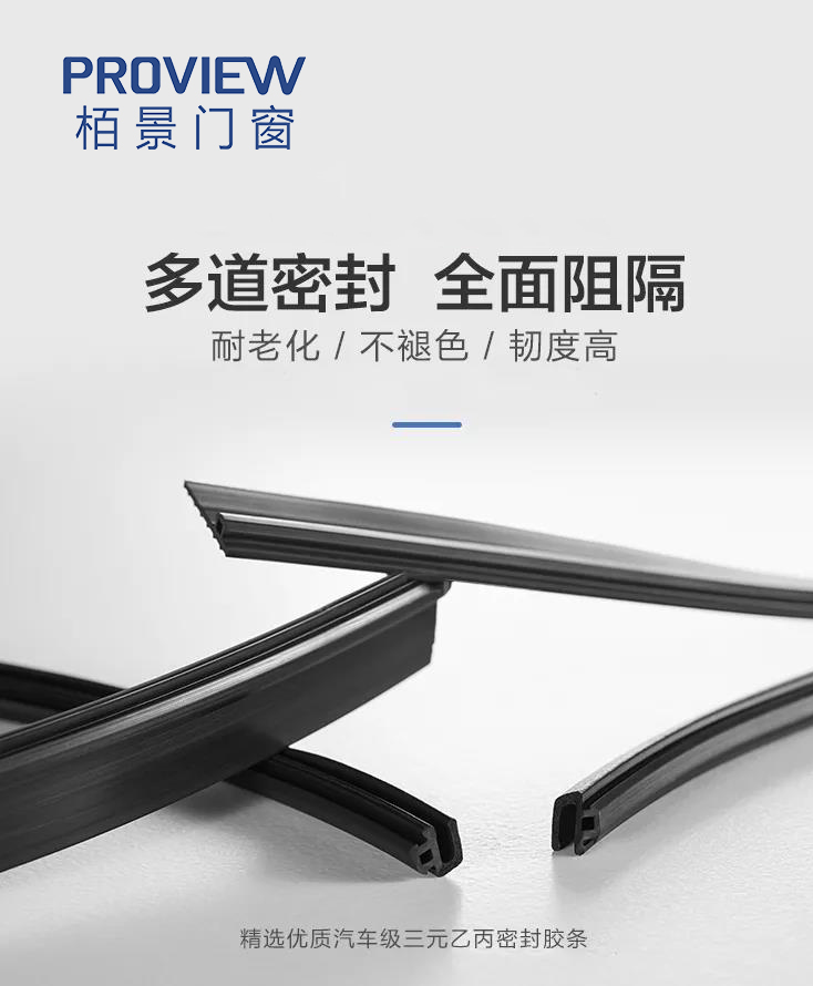 栢景系統(tǒng)門窗精選優(yōu)質(zhì)汽車級EPDM發(fā)泡膠條進行密封,膠條是壓入式的;連接型材的隔熱條在同一條直線上,形成了一個完成的隔熱層(等溫線層),有效達到冬季保溫的效果。