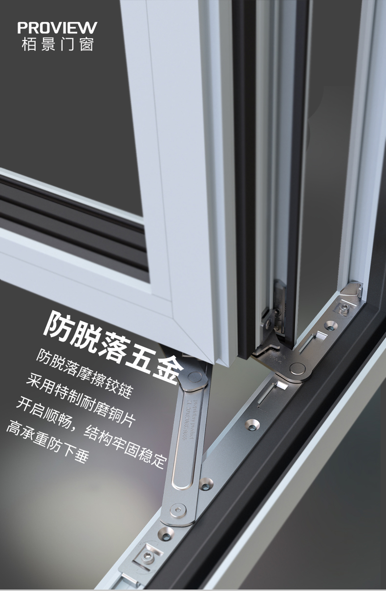 栢景門窗五金選用歐洲進(jìn)口五金配件,工藝精湛,靈活的傳動系統(tǒng),靈活開啟,精密鎖點(diǎn)及鎖座,極大增強(qiáng)了門窗的密封性能。